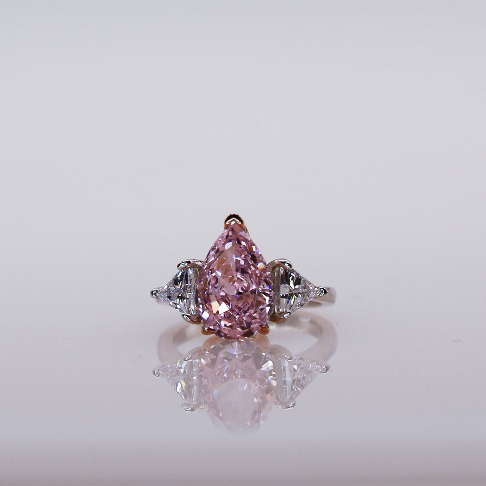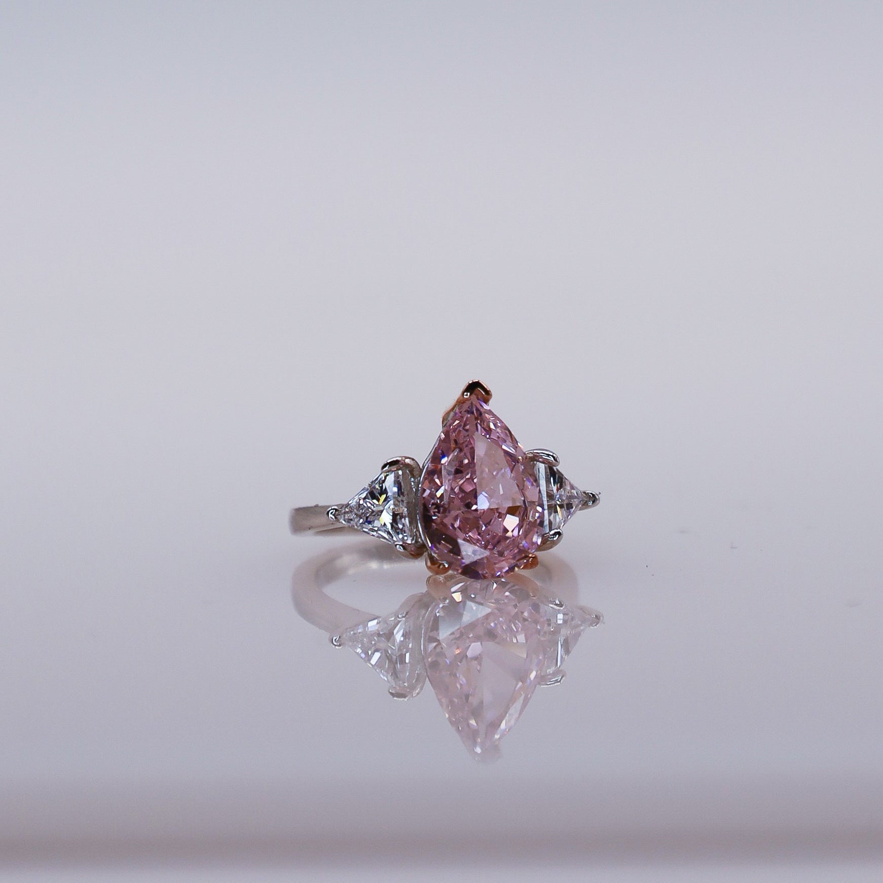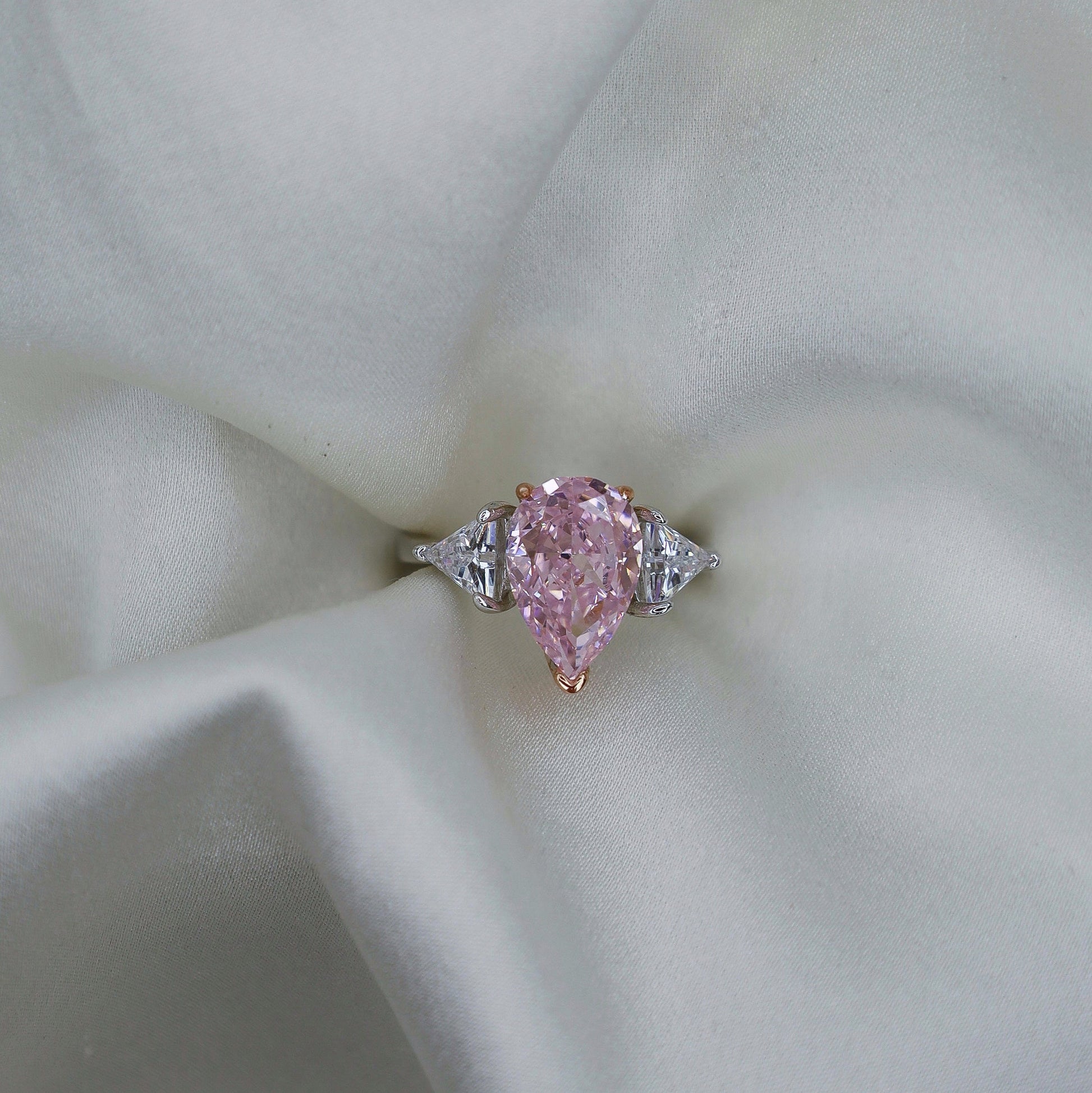 Bold, feminine, and unforgettable—the Celene ring is a showstopper in every sense. Featuring a 4-carat pear-cut pink moissanite, this piece radiates elegance with a romantic twist. Its elongated teardrop shape creates a graceful silhouette, while the brilliant trapezoid-cut side stones on either side enhance the ring’s symmetry and sparkle.
