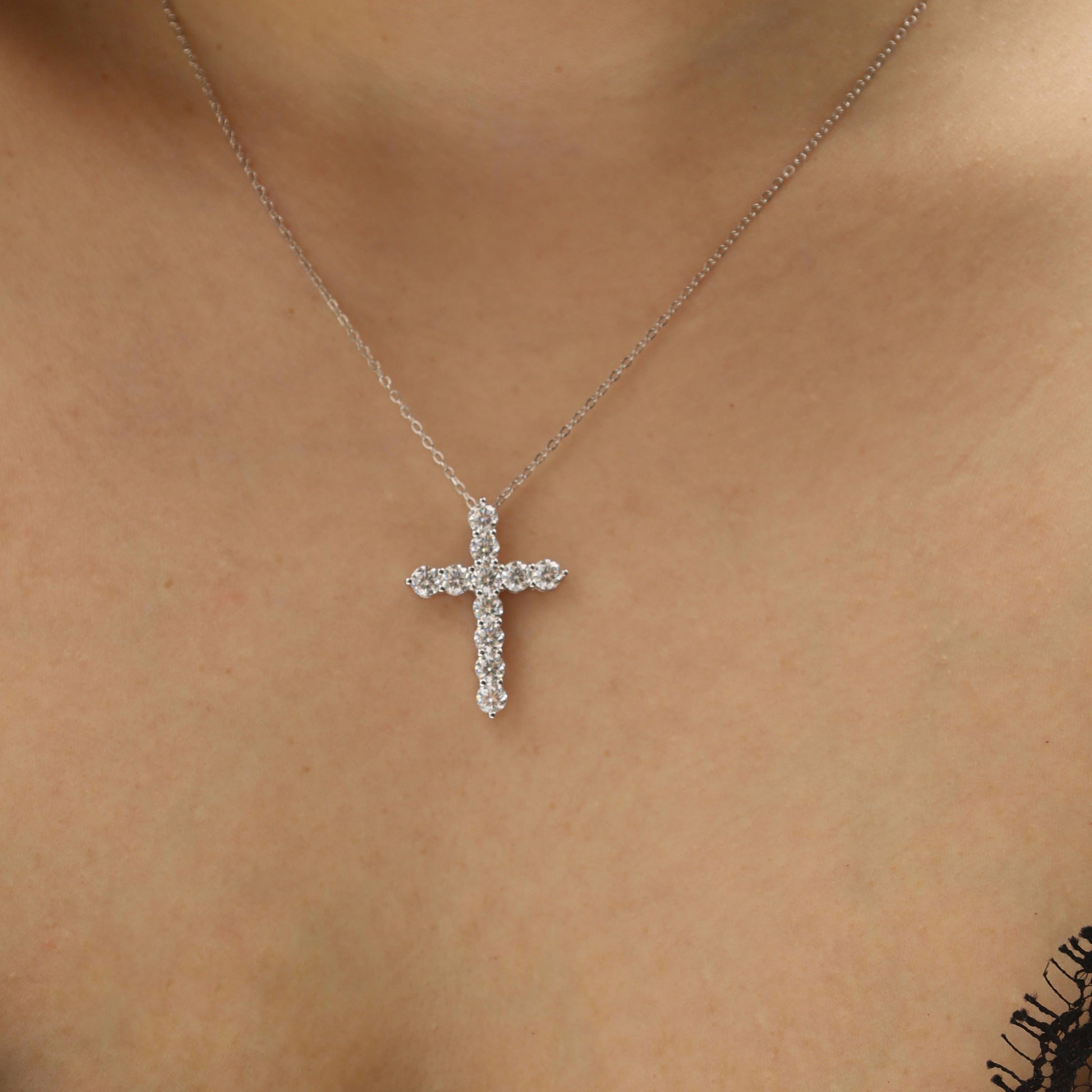 A stunning silver chain necklace featuring a radiant moissanite cross pendant. Its classic design sparkles with elegance, symbolizing faith and grace. Perfect for adding a meaningful touch to any outfit or gifting to someone special.