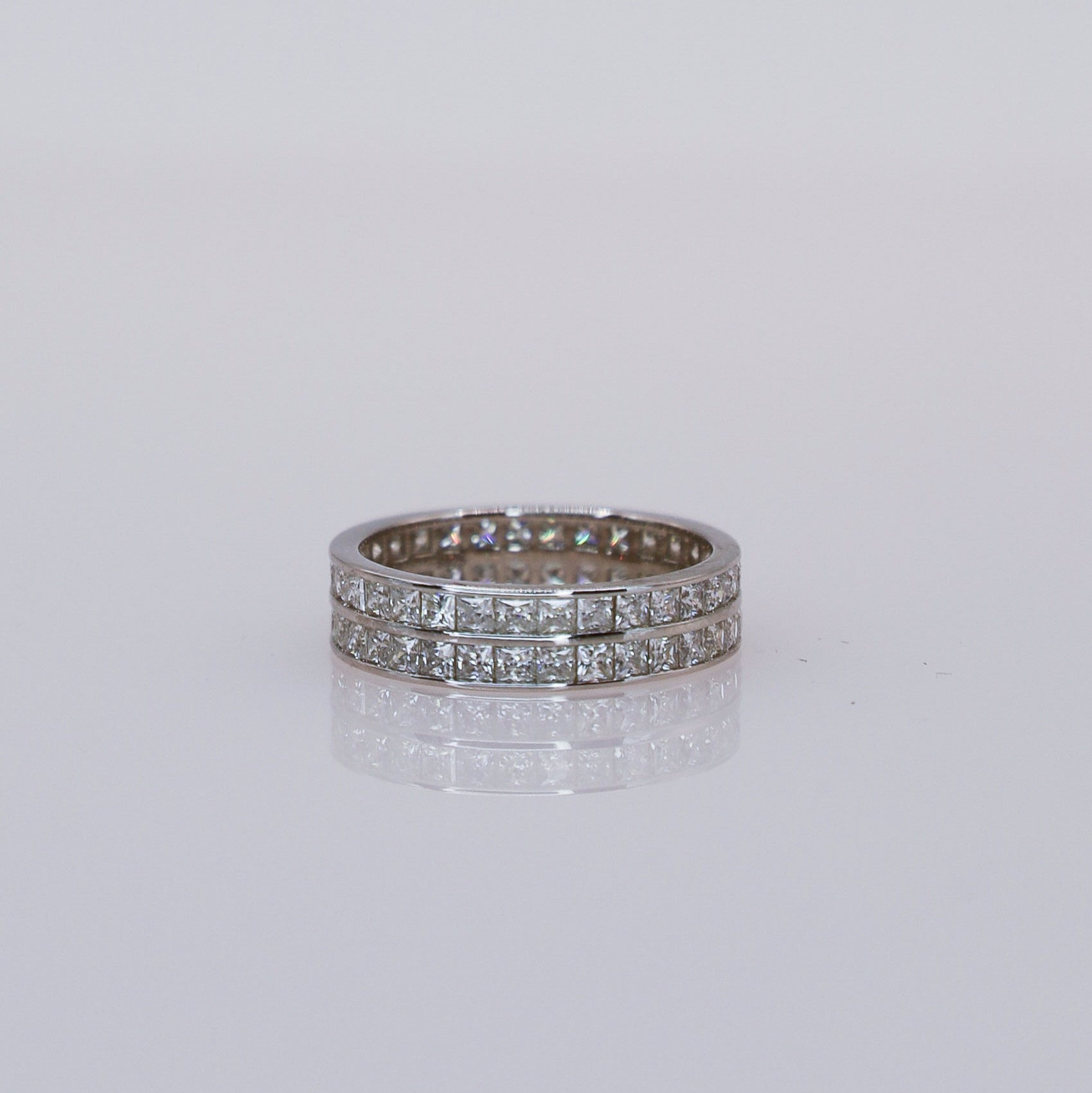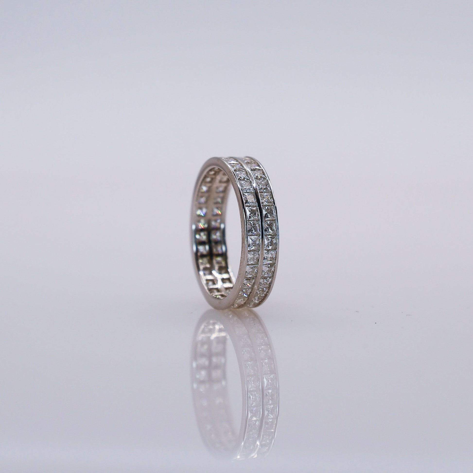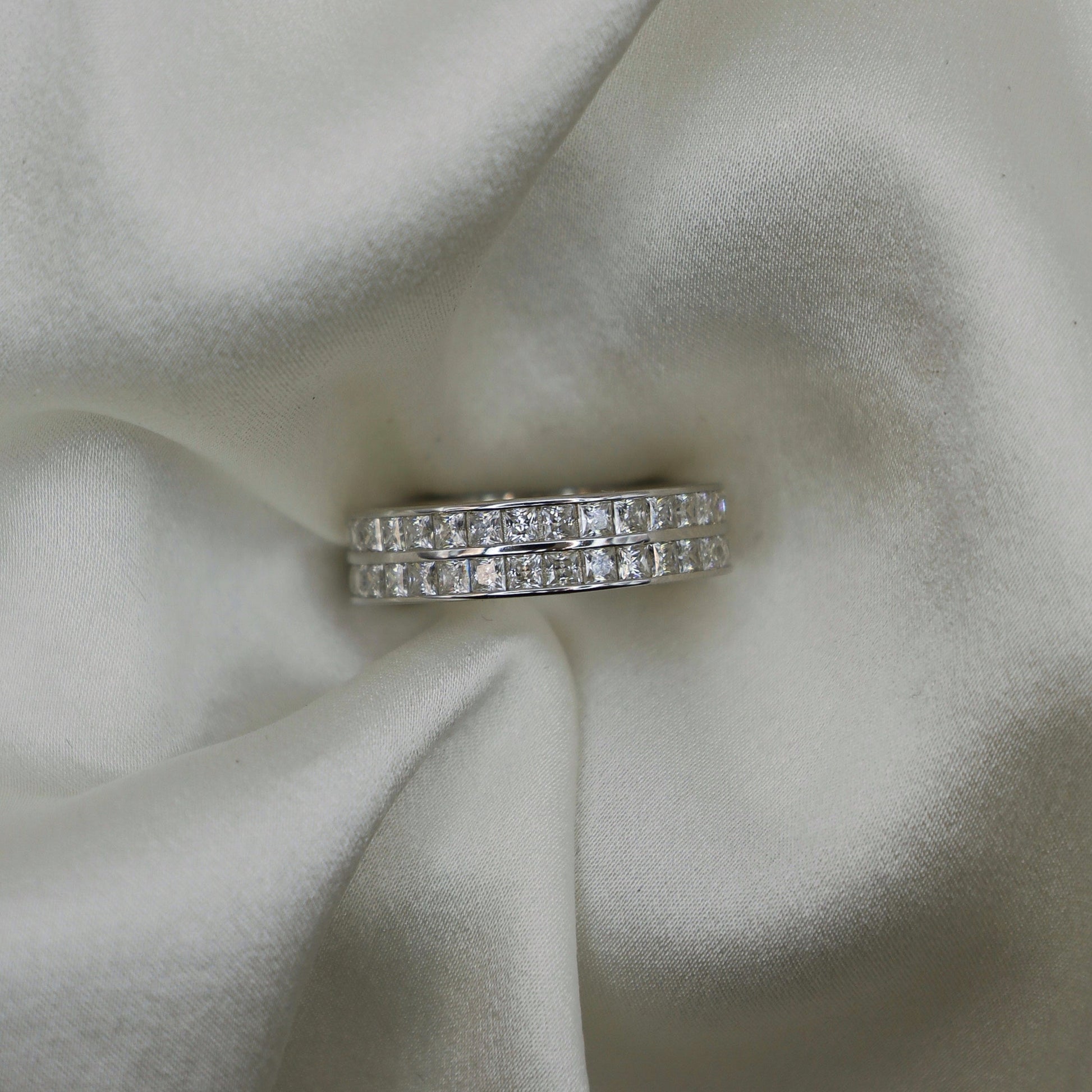 A bold statement in sophistication, The Vienna Band is crafted with two seamless rows of princess-cut moissanite stones, channel-set for maximum brilliance and durability. This eternity band radiates elegance from every angle—perfect as a wedding band, anniversary ring, or stacking piece. Its clean lines and full-circle sparkle make it a timeless addition to any jewelry collection.
