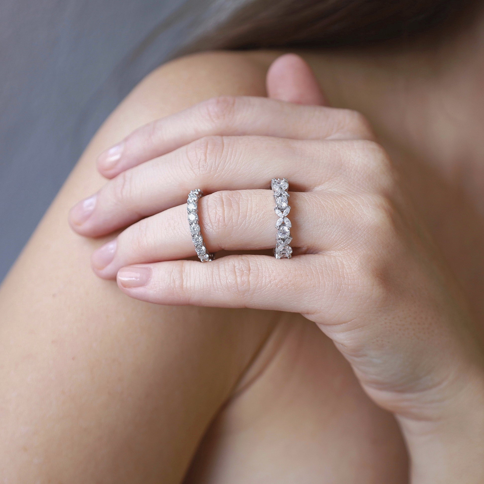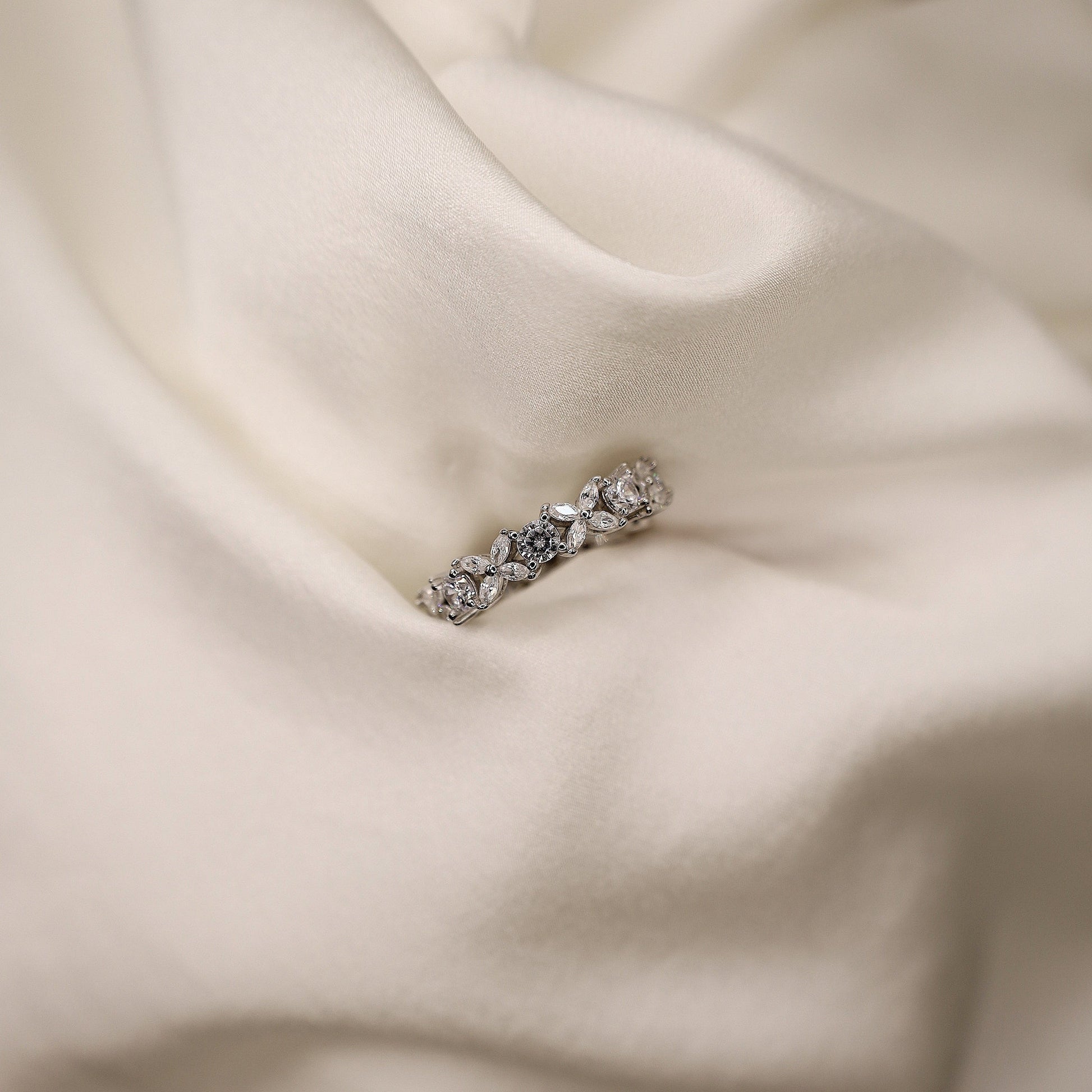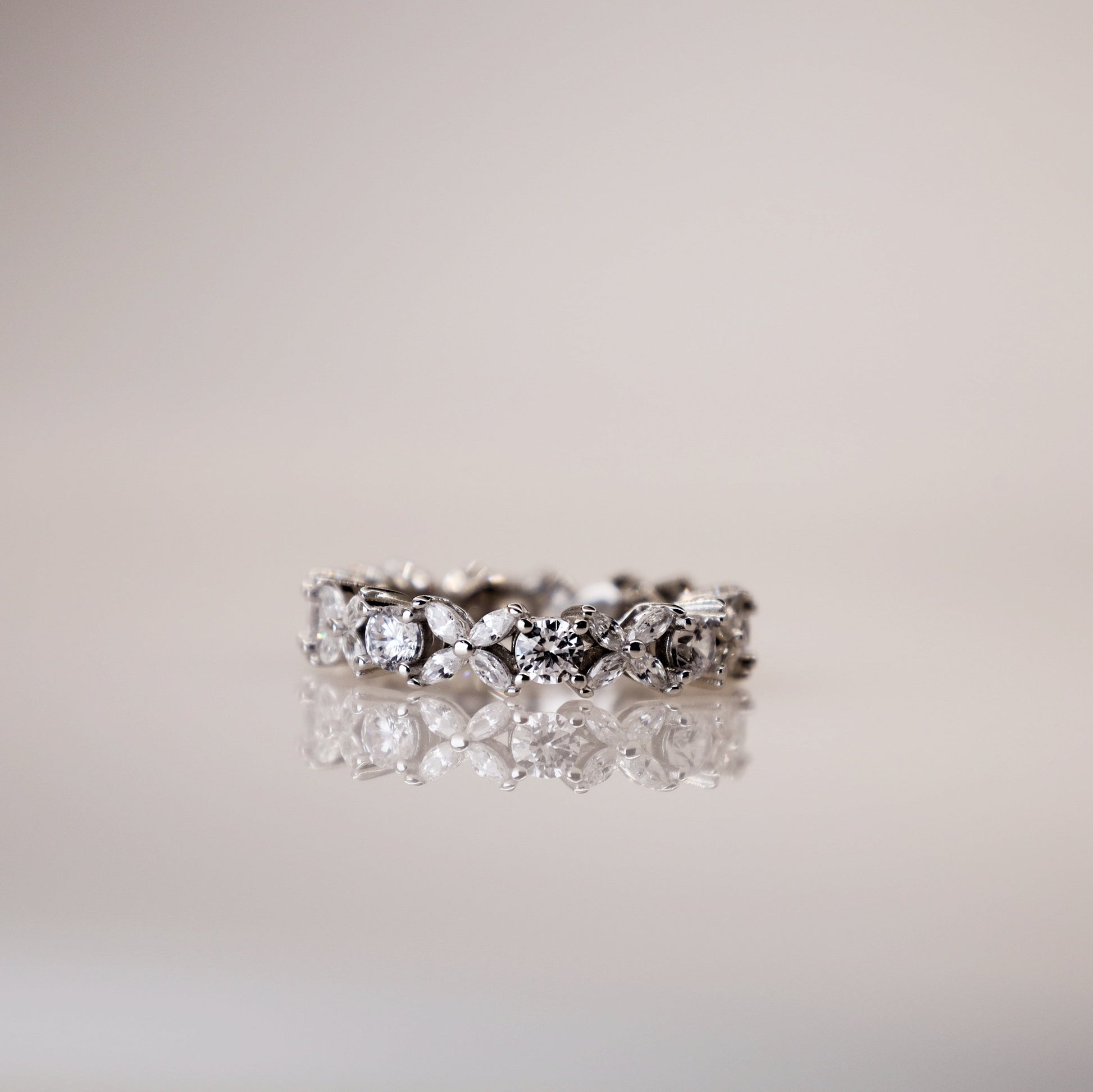 A delicate yet dazzling symbol of elegance, the Princess Band features a sleek silver band adorned with sparkling moissanite stones. Its timeless design radiates brilliance and sophistication, making it the perfect choice for stacking, daily wear, or as a refined wedding band. Fit for royalty, this piece adds a touch of grace to any collection.