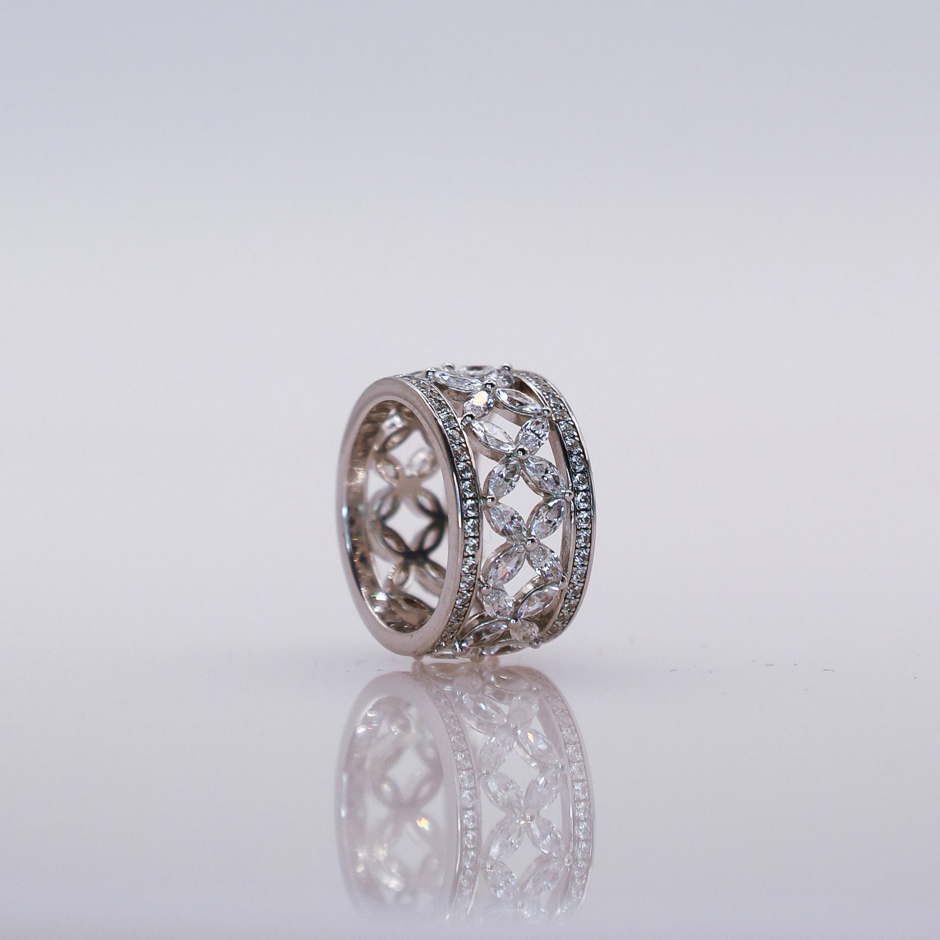 The openwork design allows light to pass through the stones, enhancing their brilliance and giving the ring a luminous, airy feel despite its bold silhouette. Whether worn solo or stacked for maximum impact, the Château Band is the perfect blend of craftsmanship, sparkle, and sophistication.