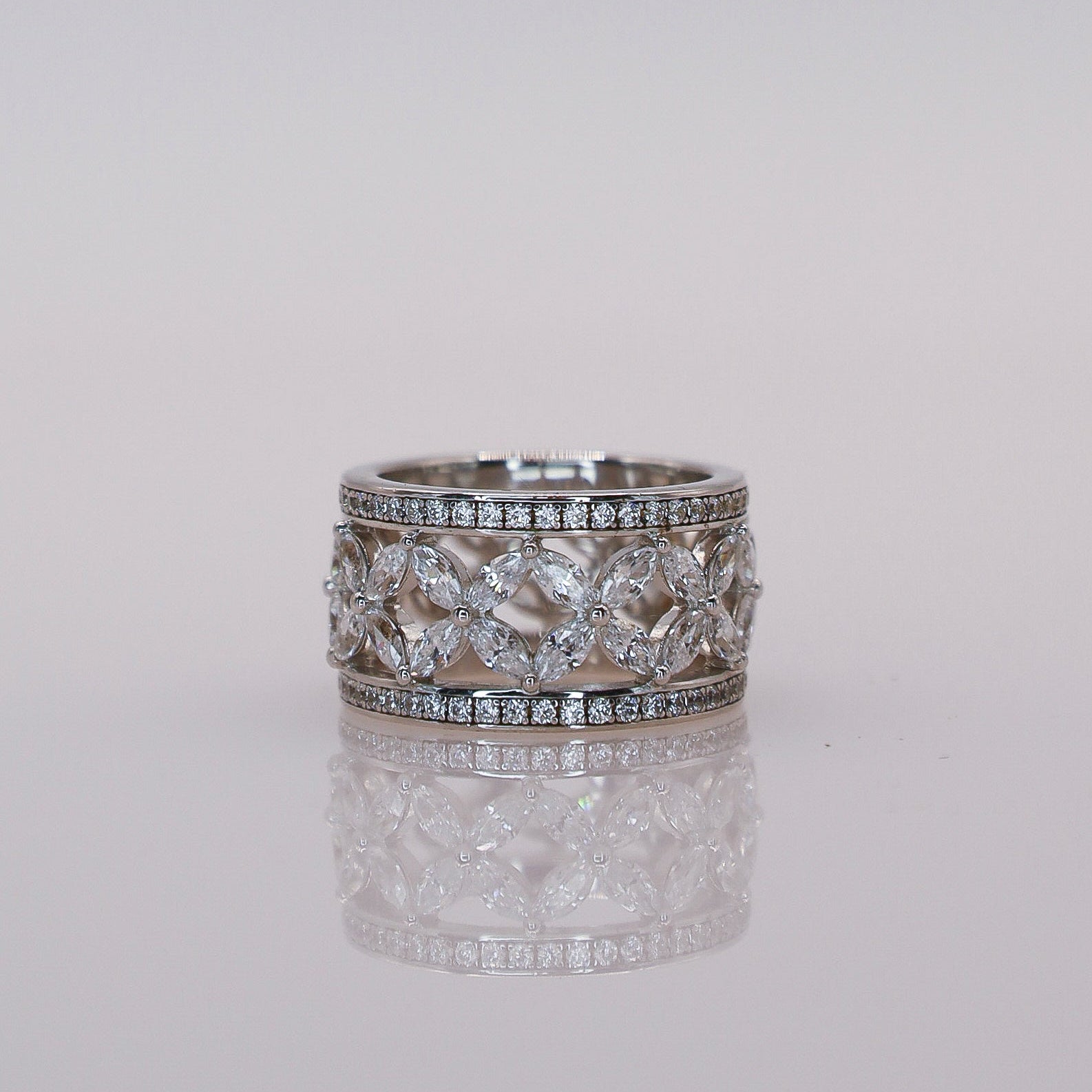 Make a bold yet elegant statement with the Château Band—a wide band ring designed to captivate from every angle. Featuring an intricate lattice of marquise-cut moissanite stones framed by pavé-set borders, this piece evokes timeless European glamour with a contemporary twist.