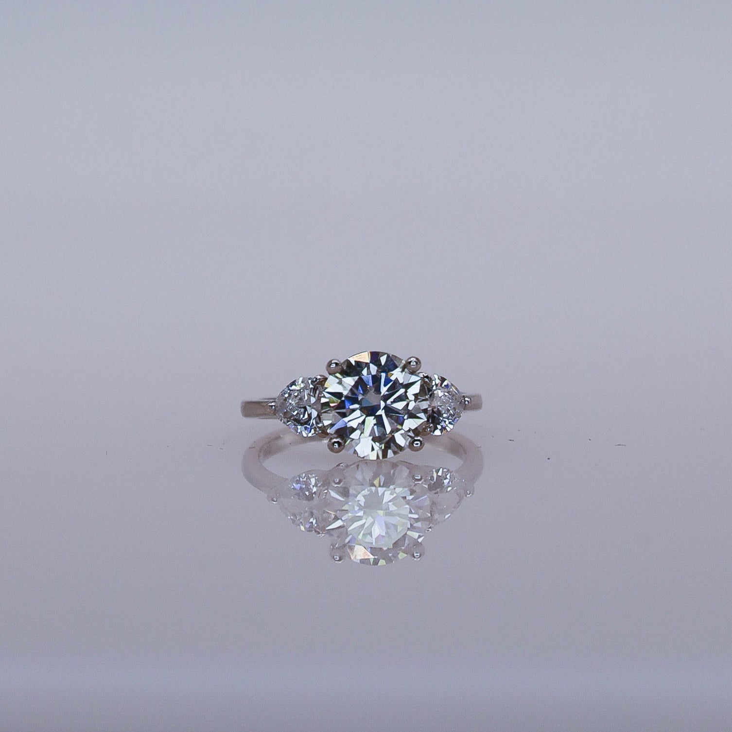 The Aurielle ring is a timeless expression of balance, beauty, and brilliance. At its heart sits a round-cut moissanite that sparkles with fire and clarity, flanked by two smaller side stones that enhance its radiance without overpowering it. This three-stone design symbolizes the past, present, and future—making it an especially meaningful choice for engagements or significant milestones.