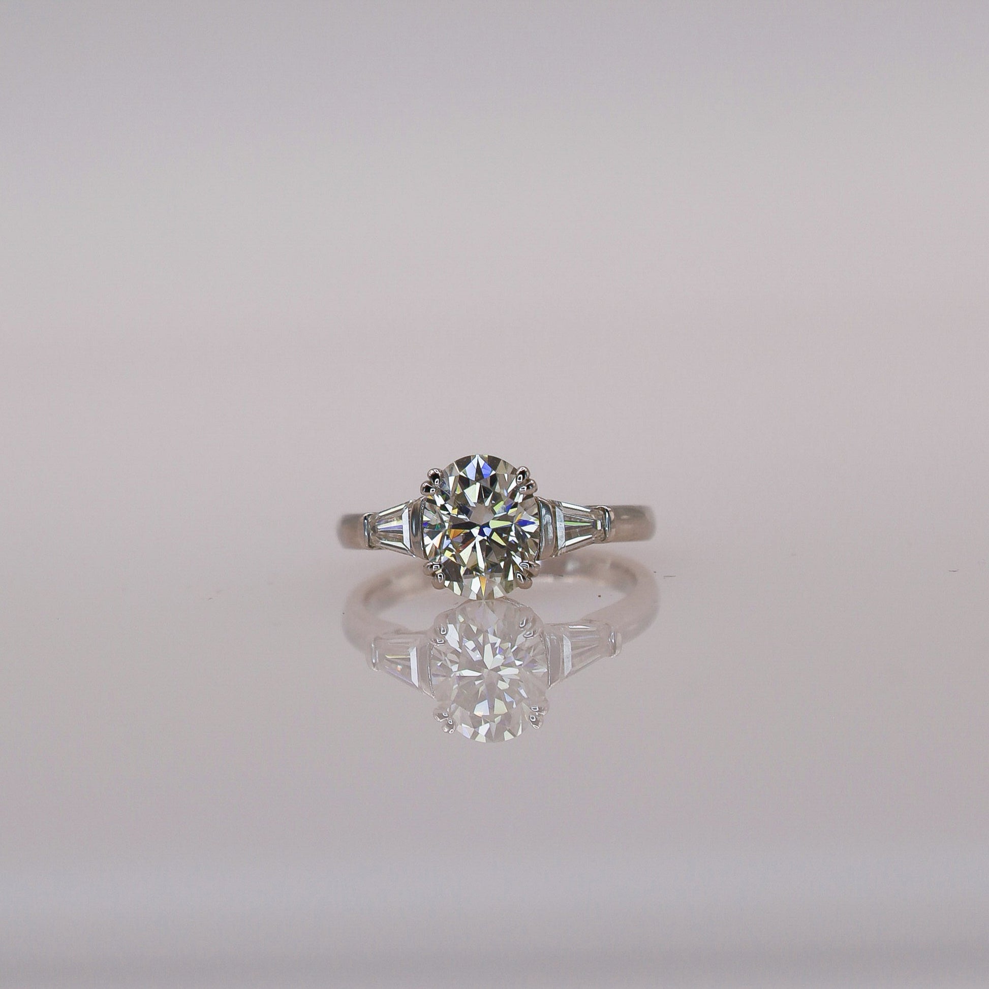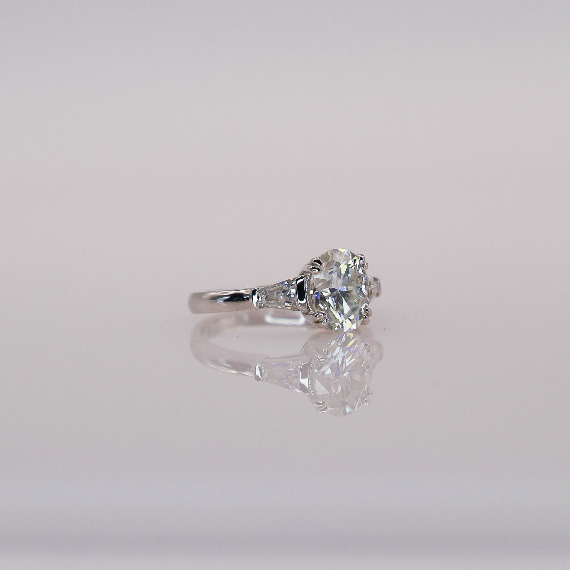 Timeless elegance meets understated sparkle in The Celeste Ring. Featuring a brilliant round-cut moissanite center stone, this design is flanked by sleek tapered baguettes on either side, set in polished sterling silver. Whether you're marking a milestone or simply treating yourself, this classic silhouette brings a refined charm to every moment. Handpicked for its fire and clarity, this ring offers the look of a diamond with the ethical and affordable brilliance of moissanite.